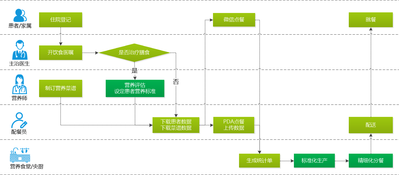 采用PDA或平板點餐,無紙化,自動根據(jù)飲食醫(yī)囑匹配灶類,數(shù)據(jù)可追溯,降低出錯率